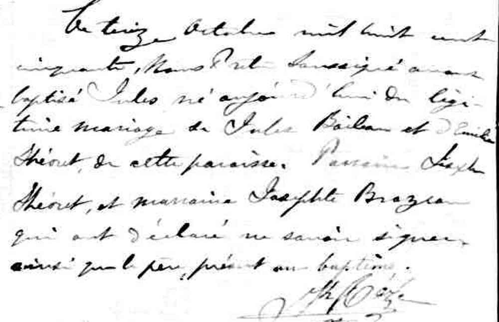 Baptême de Jules Mathias Boileau à Saint Raphaël de l'île Bizard le 13 octobre 1850