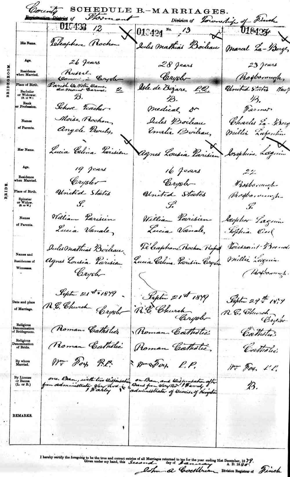 Mariage de Jules Mathias Boileau et Agnès Louisa Parisien le 21 septembre 1879
