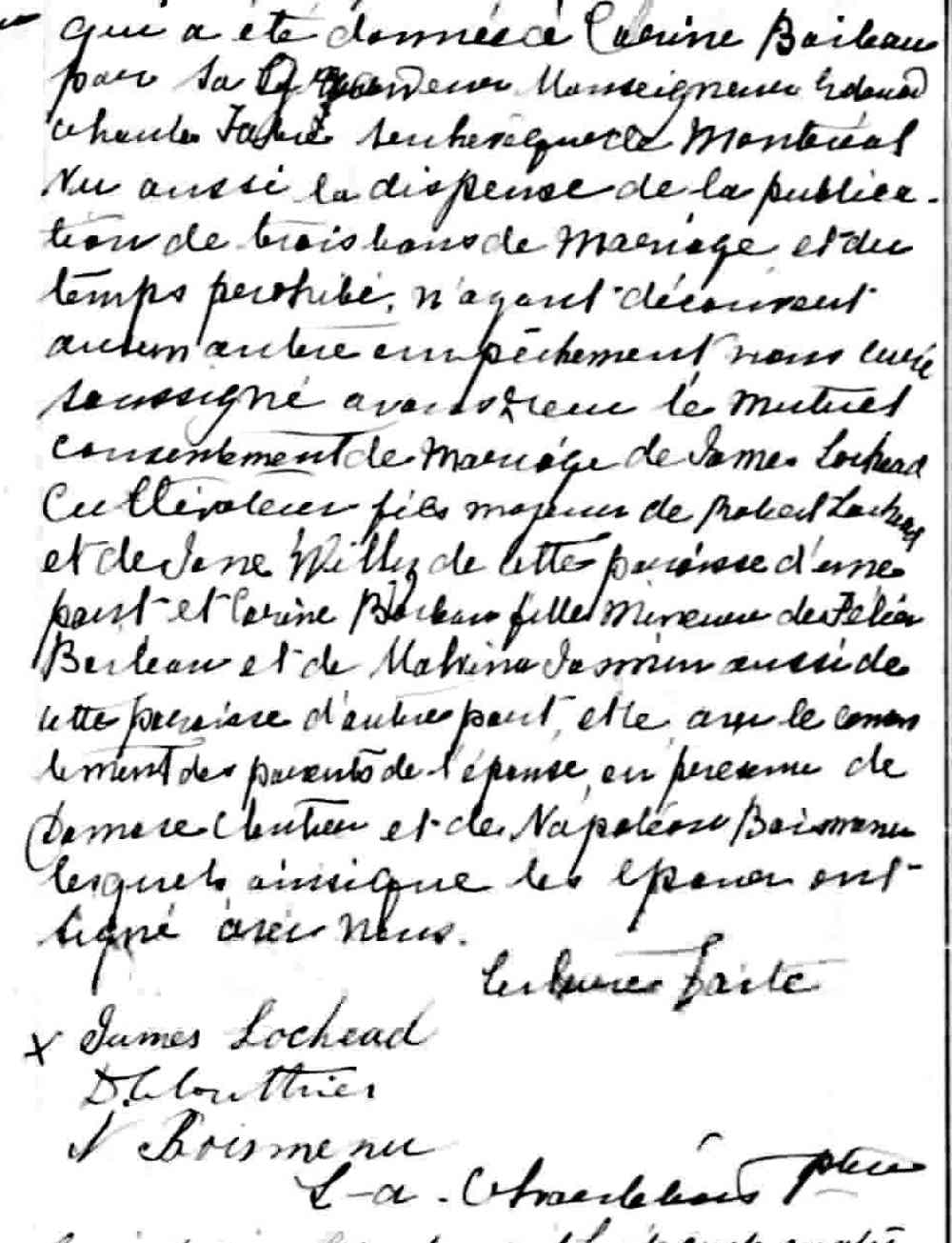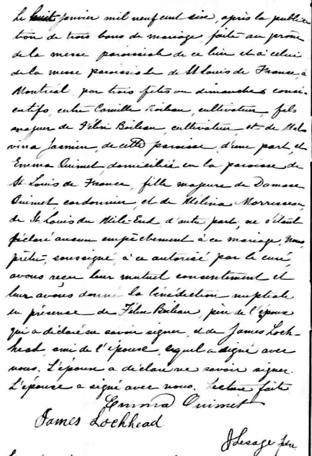 Mariage de Corinne Boileau et James Lockhead à Sainte Thérèse le 24 décembre 1889
