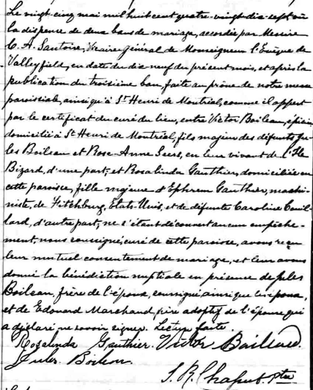 Mariage de Victor Boileau et Rosalinda Gauthier à Chateauguay le 25 mai 1897