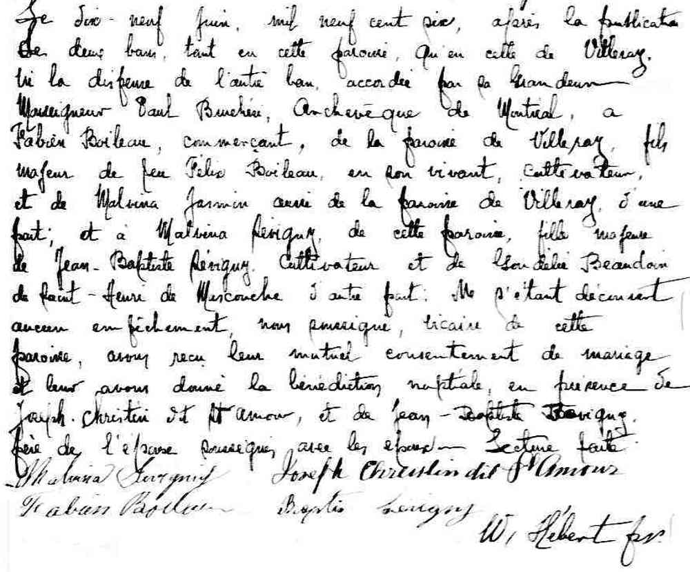 Mariage de Fabien Boileau et Malvina Sévigny à Notre-Dame de Montréal le 19 juin 1906