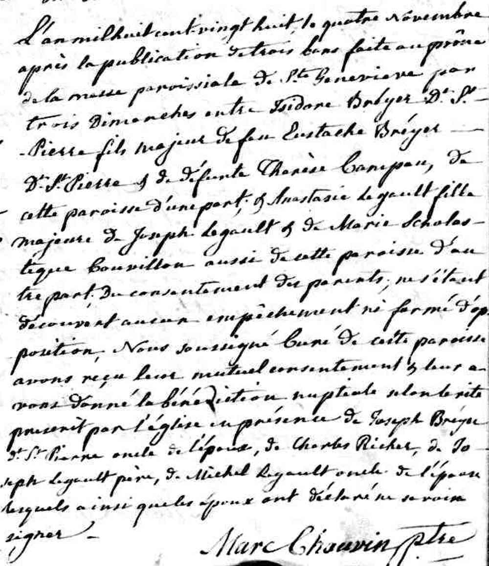 Mariage de Isidore Brayer Saint-Pierre et de Anastasie Legault à Sainte-Geneviève le 4 novembre 1828