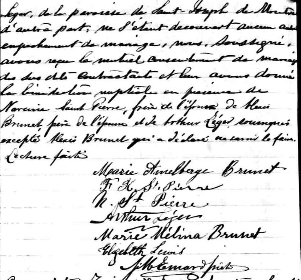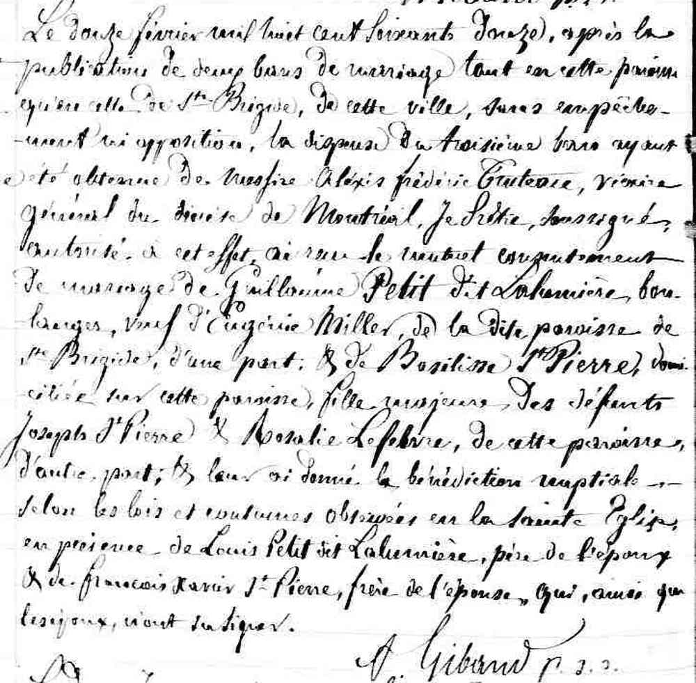 Mariage de Basilisse Saint-Pierre et Guillaume Lalumière Petit à Notre Dame de Montréal le 12 février 1872
