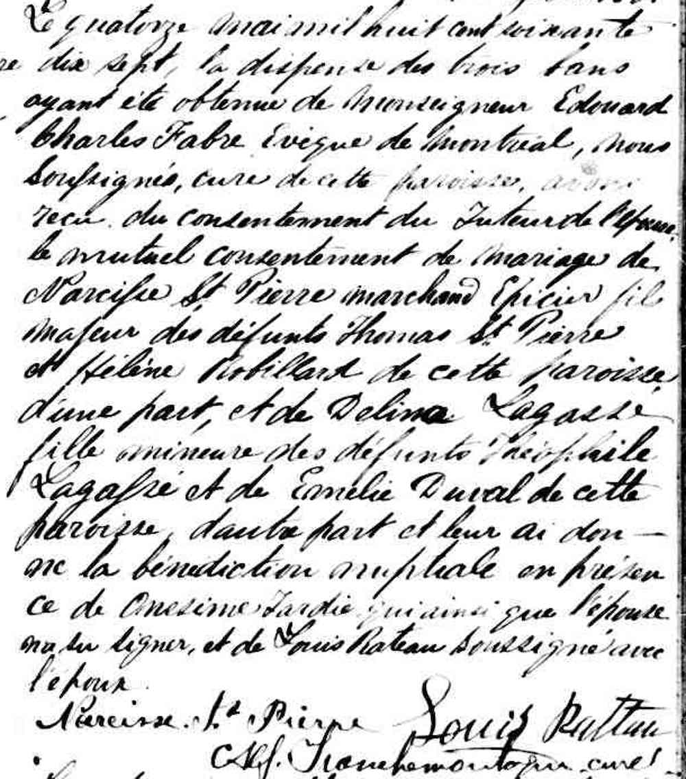 Mariage de Narcisse Saint-Pierre et Delima Lagassé à Saint Joseph de Montréal le 14 mai 1877