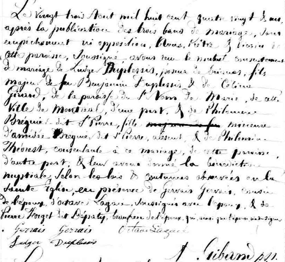 Mariage de Philomène Brayer Saint-Pierre et Ludger Duplessis à Notre Dame de Montréal le 23 août 1881