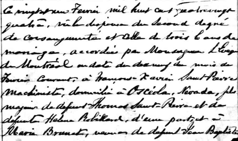 Mariage de François Xavier Saint-Pierre et Marie Brunet à la Cathédrale Saint Jacques de Montréal le 21 février 1884