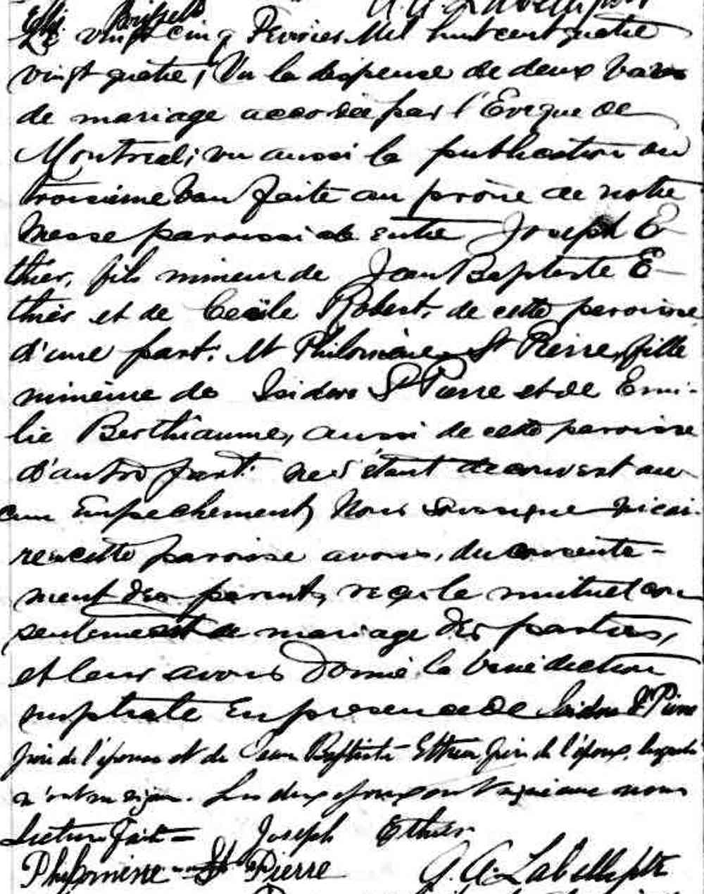 Mariage de Philomène Saint-Pierre et Joseph Ethier à Saint Henri de Montréal le 25 février 1884