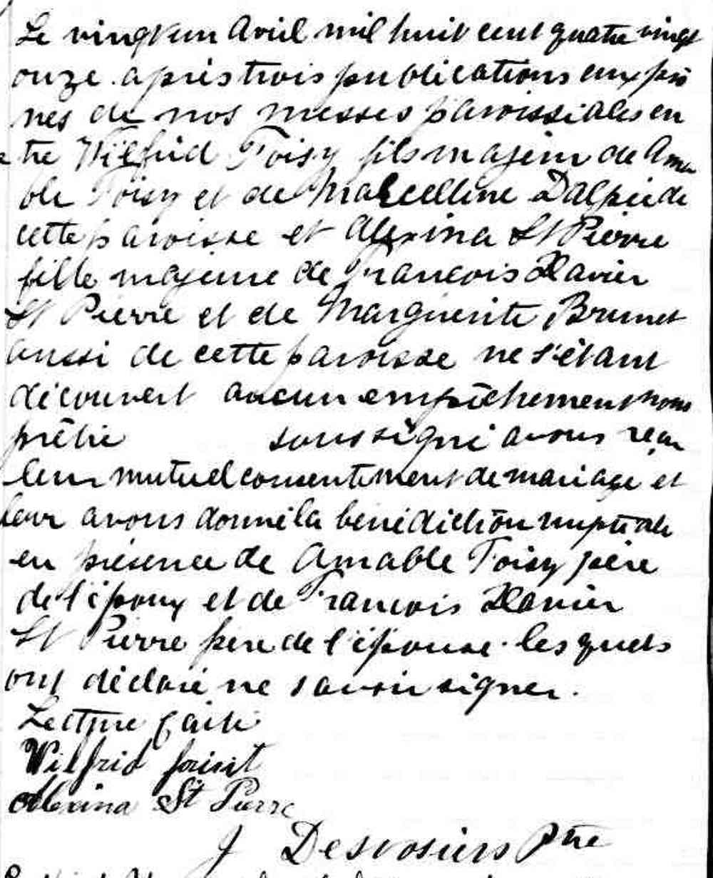 Mariage de Alexina Saint-Pierre et Wilfrid Foisy à Sainte Brigide de Montréal le 21 avril 1891