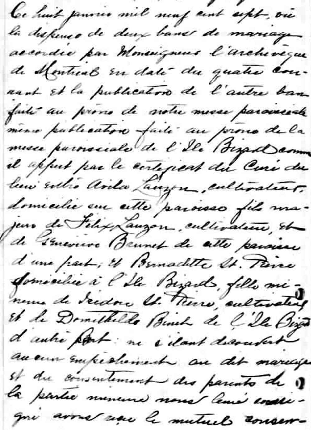 Mariage de Bernadette Saint-Pierre et Avila Lauzon à Sainte Geneviève le 8 janvier 1907