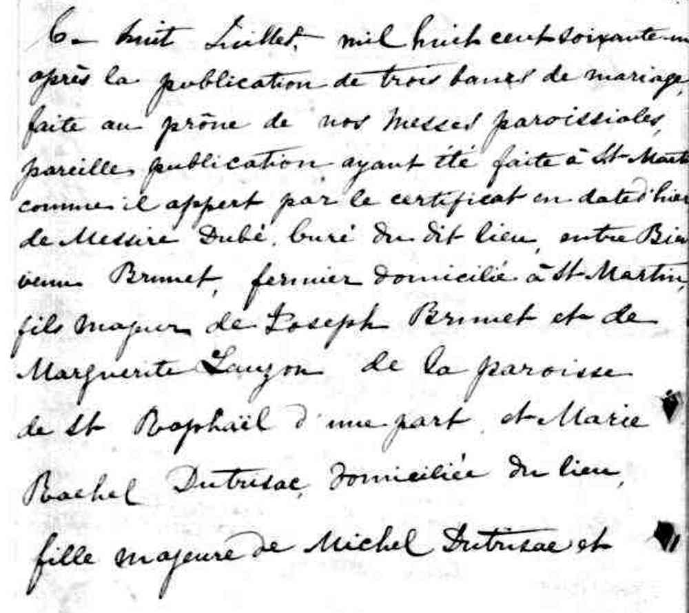 Mariage de Bienvenu Brunet et Marie Rachel Dutrisac à Sainte Rose (Laval) le 8 juillet 1861