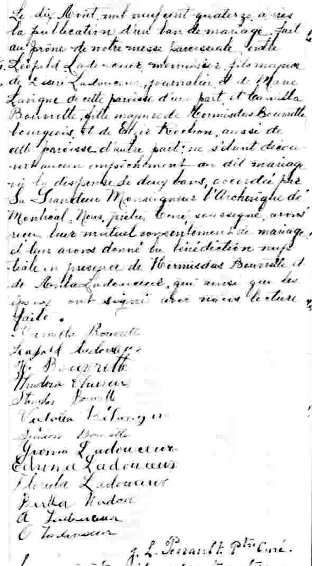 Mariage de Léopold Ladouceur et Camilla Bouvrette à Notre Dame des Neiges de Montréal le 10 août 1914