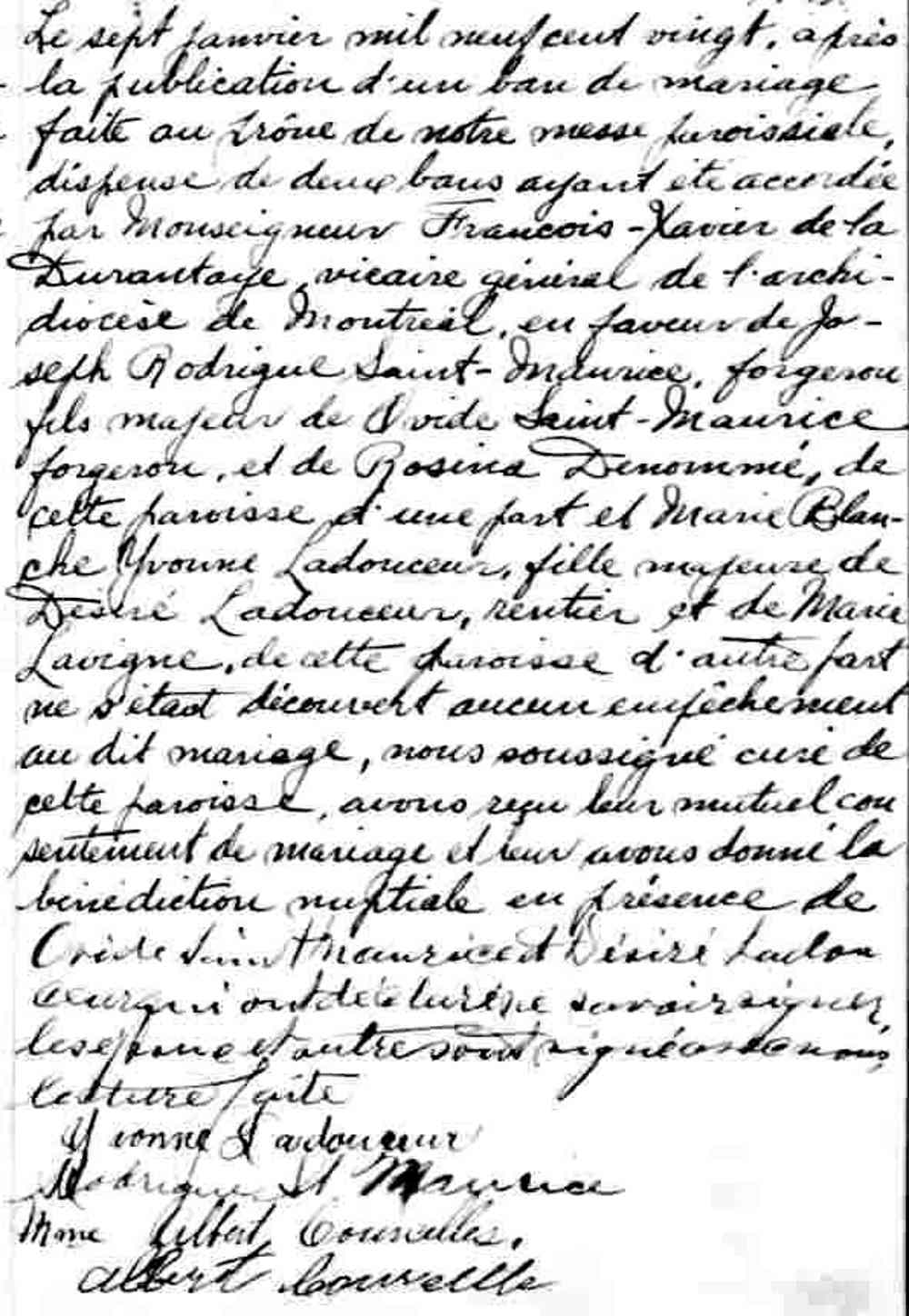 Mariage de Marie Blanche Yvonne Ladouceur et Joseph Rodrigue Saint-Maurice aux Saints Anges Gardiens de Lachine le 7 janvier 1920