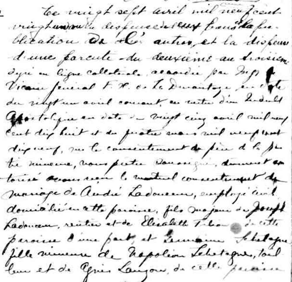 Mariage de André Ladouceur et Germaine Schetagne à Sainte Irène de Montréal le 27 avril 1921