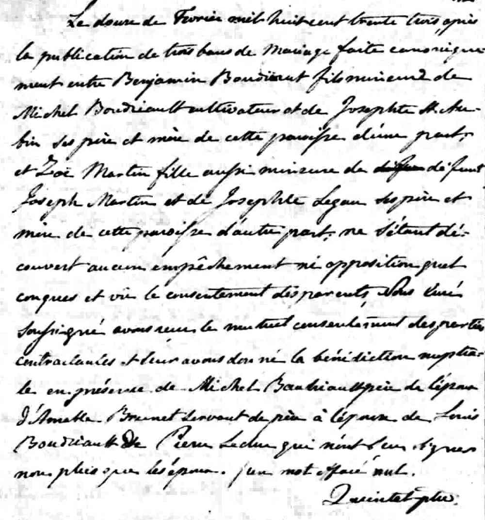 Mariage de Zoé Martin et Benjamin Boudriault à Saint Clément de Beauharnois le 12 février 1833
