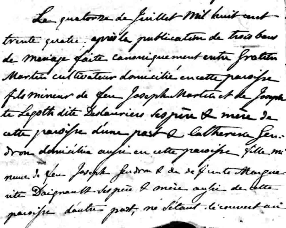 Mariage de Gratien Martin et Catherine Gendron à Saint Clément de Beauharnois le 14 juillet 1834