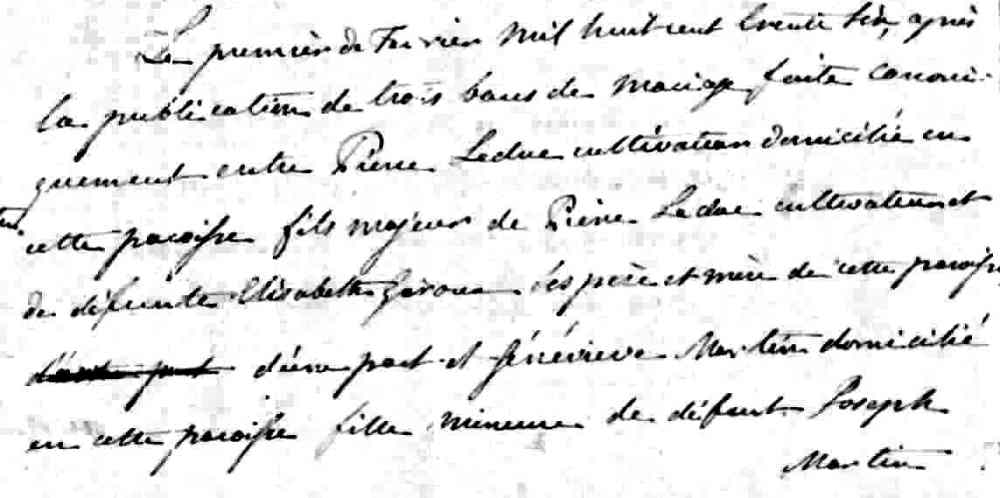 Mariage de Geneviève Martin et Pierre Leduc à Saint Clément de Beauharnois le 1er février 1836