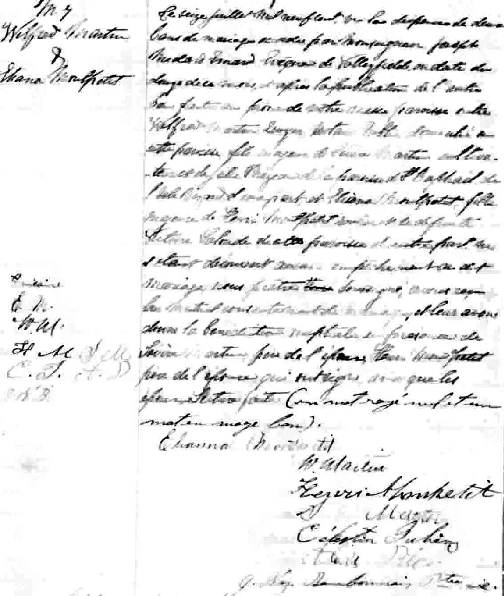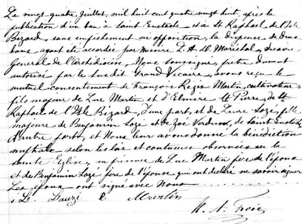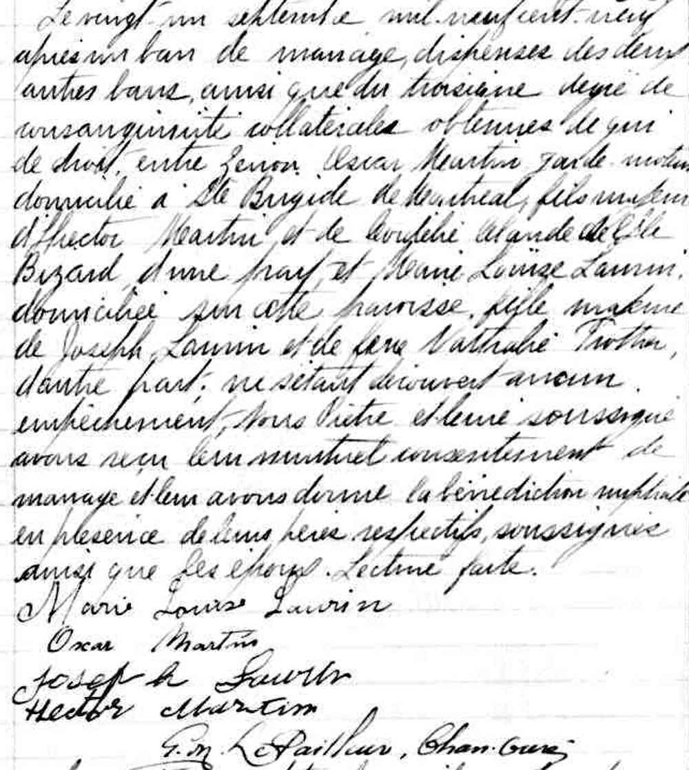 Mariage de Régis Martin et Laure Lauzé à Saint Jacques de Montréal le 24 juillet 1888