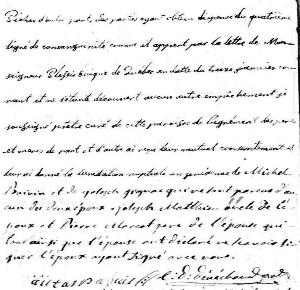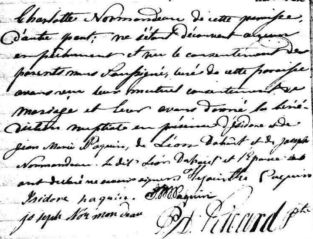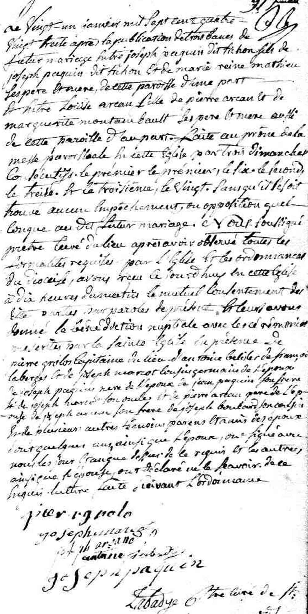 Mariage de Joseph Paquin et Marie Louise Arcand à Saint Joseph de Deschambault le 21 janvier 1793