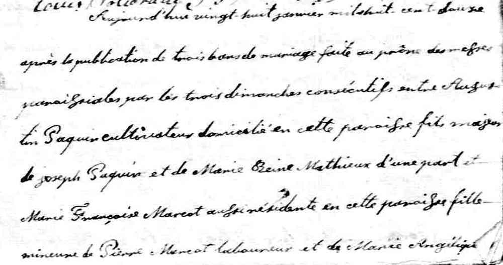 Mariage de Augustin Paquin et Françoise Marcot à Saint Joseph de Deschambault le 28 janvier 1812