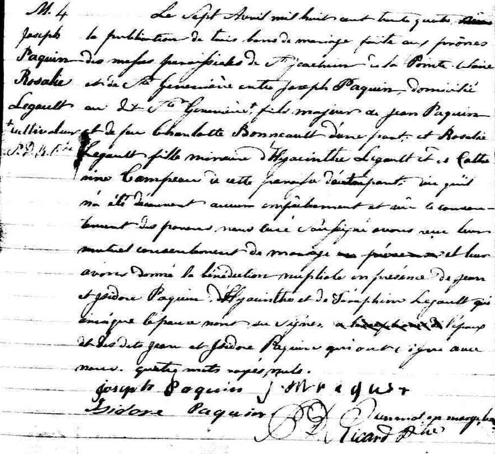 Mariage de Joseph Paquin et Rosalie Legault à la Pointe Claire le 7 avril 1834