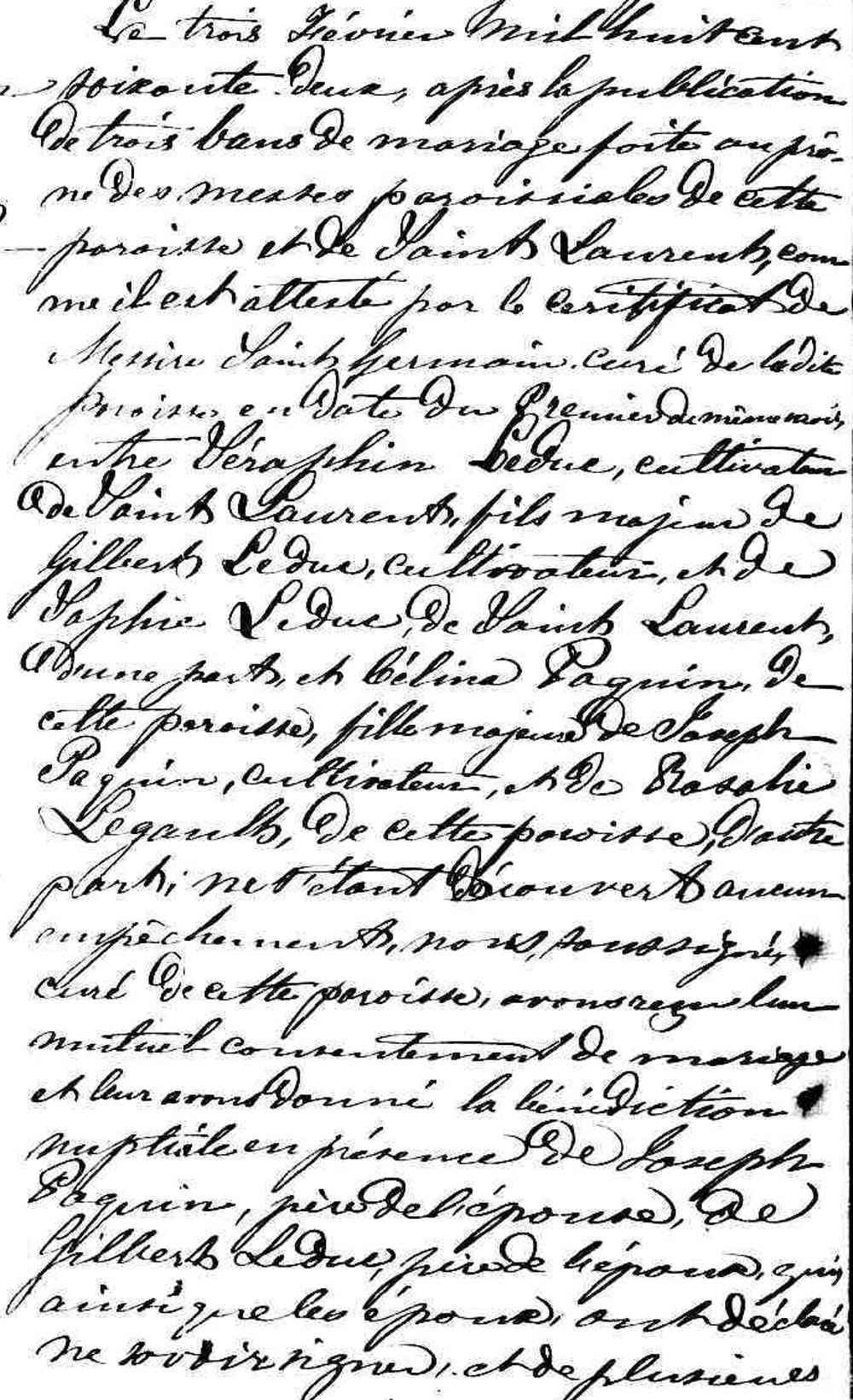 Mariage de Célina Paquin et Séraphin Leduc le 3 février 1862