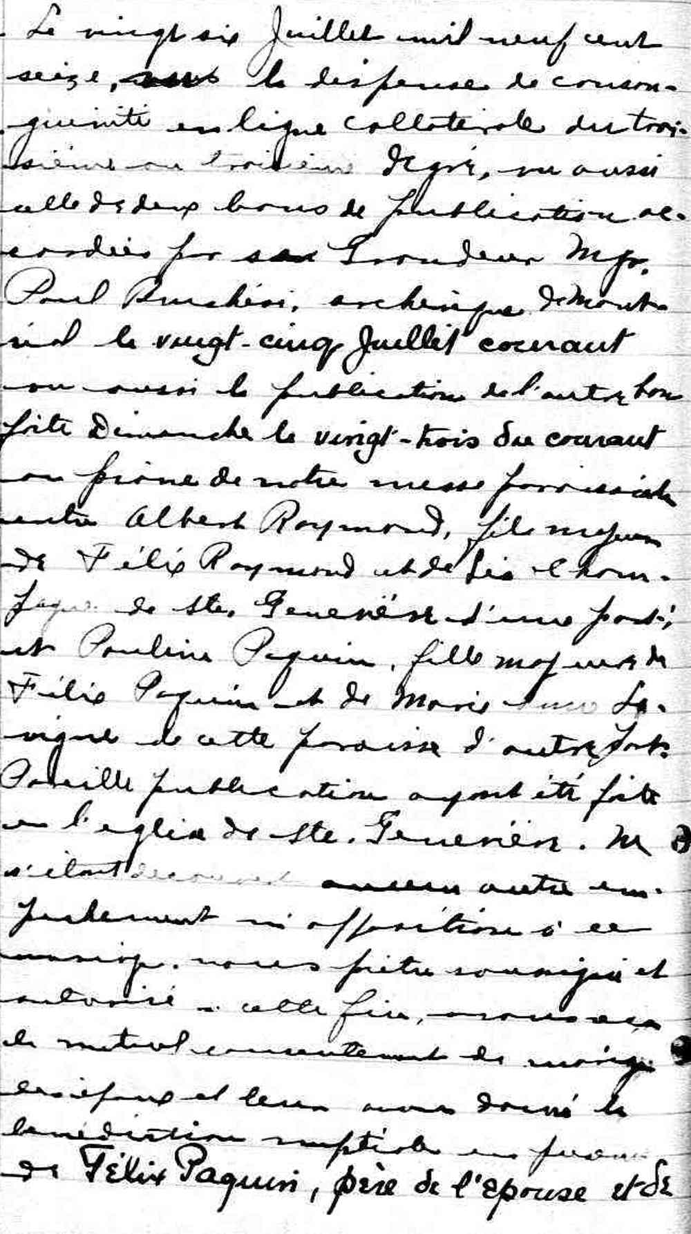 Mariage de Pauline Paquin et Albert Raymond à Sainte Anne de Bellevue le 26 juillet 1916