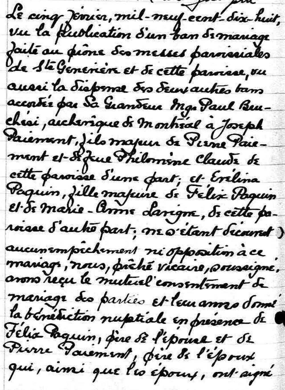 Mariage de Evelina Paquin et Joseph Paiement à Sainte Anne de Bellevue le 5 février 1918
