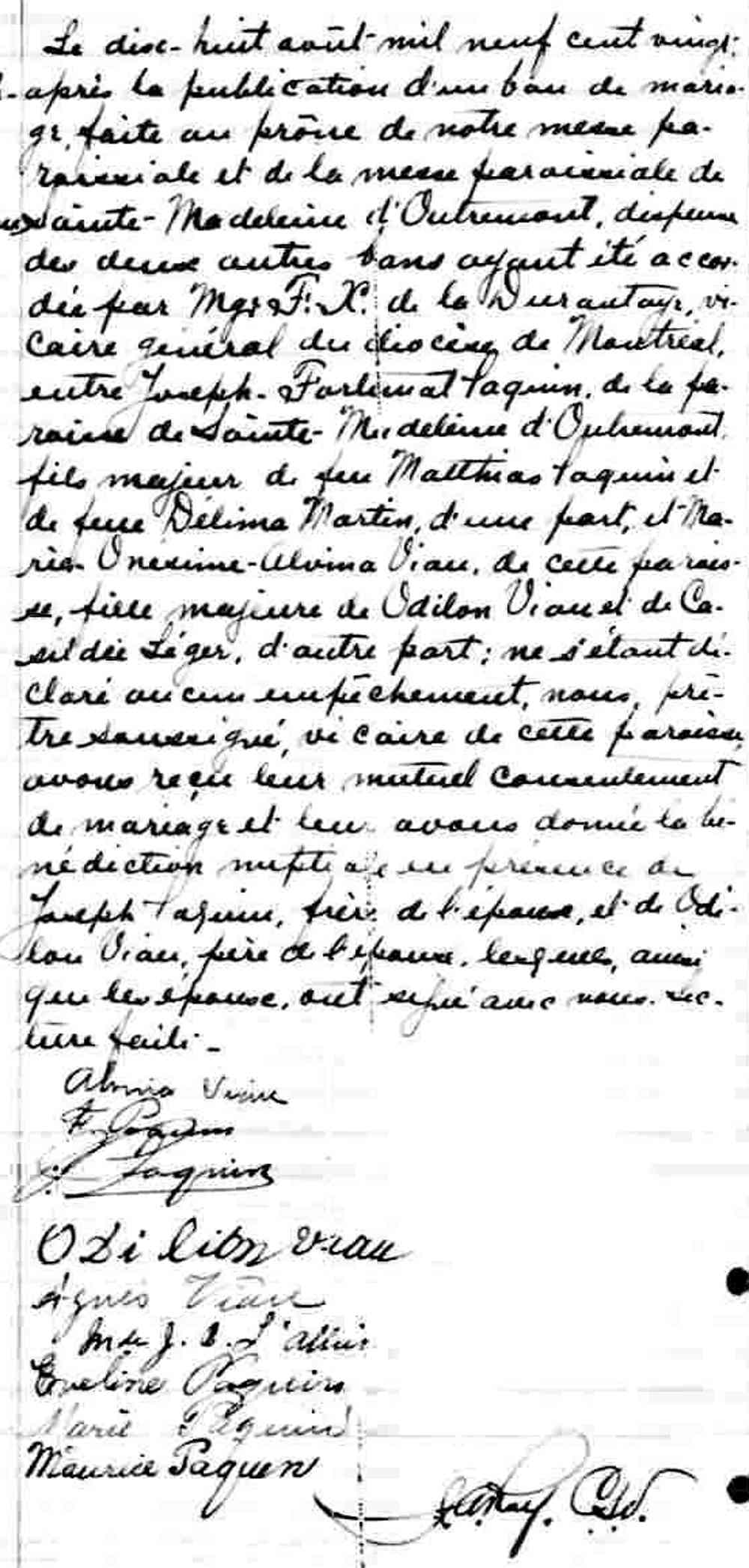 Mariage de Joseph Fortunat Paquin et Marie Onésime Alvina Viau à Saint Viateur d'Outremont le 18 avril 1920
