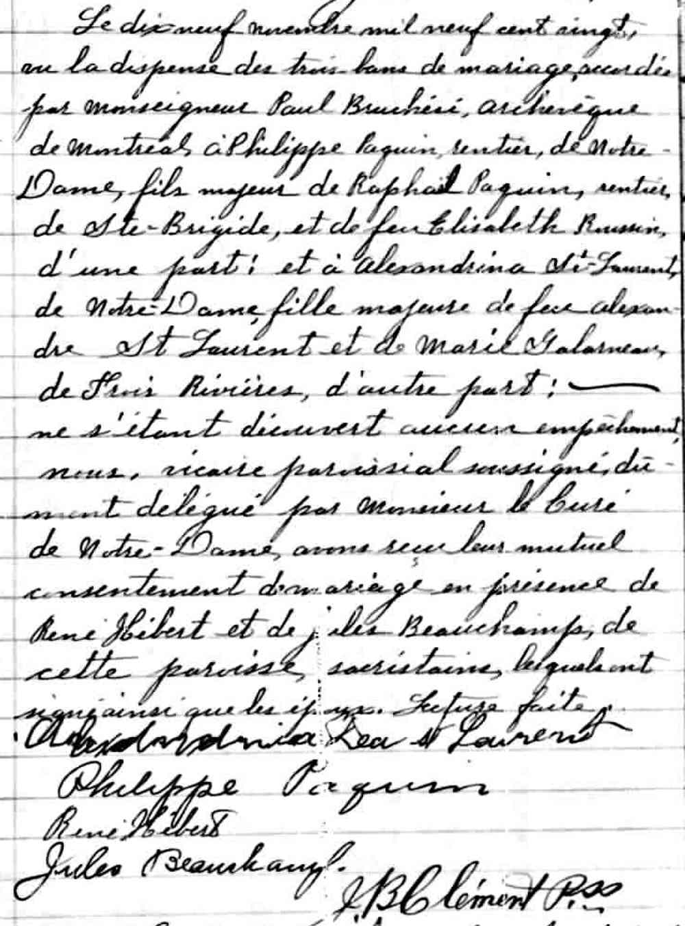 Mariage de Philippe Paquin et Alexandrine Saint-Laurent à la Cathédrale Saint Jacques de Montréal le 19 novembre 1920