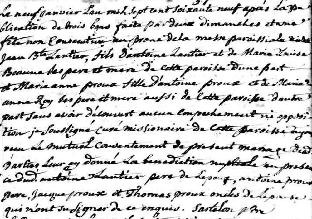 Mariage de Marie Anne Proulx et Jean Baptiste Lanthier à la Pointe Claire le 9 janvier 1769