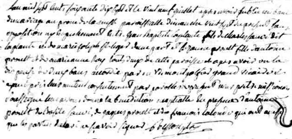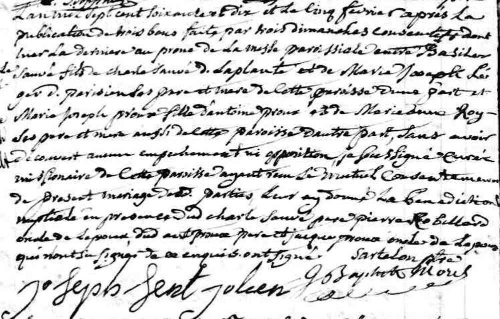 Mariage de Marie Josephe Proulx et Basile Sauvé Laplante à la Pointe Claire le 5 février 1770