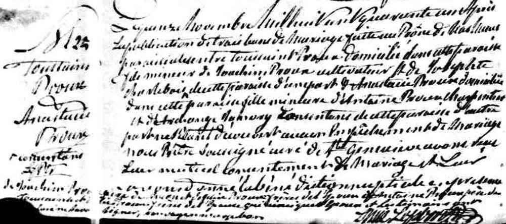 Mariage de Suzanne Proulx et Jean Baptiste Sauvé Laplante à Sainte Geneviève le 29 juillet 1777