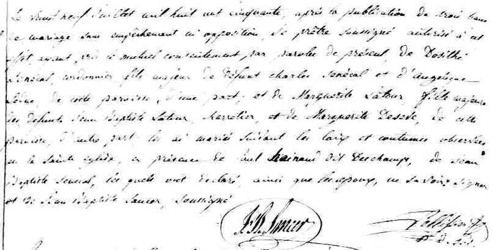Mariage de Dorothé Sénécal et Marguerite Latour à Notre Dame de Montréal le 29 juillet 1850