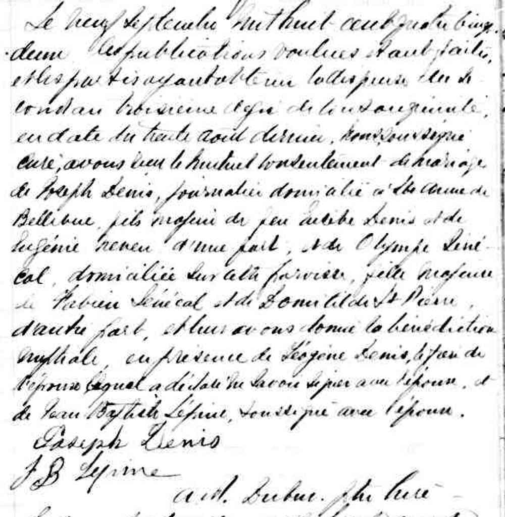 Mariage de Olympe Sénécal et Joseph Denis au Sacré Coeur de Jésus de Montréal le 9 septembre 1882