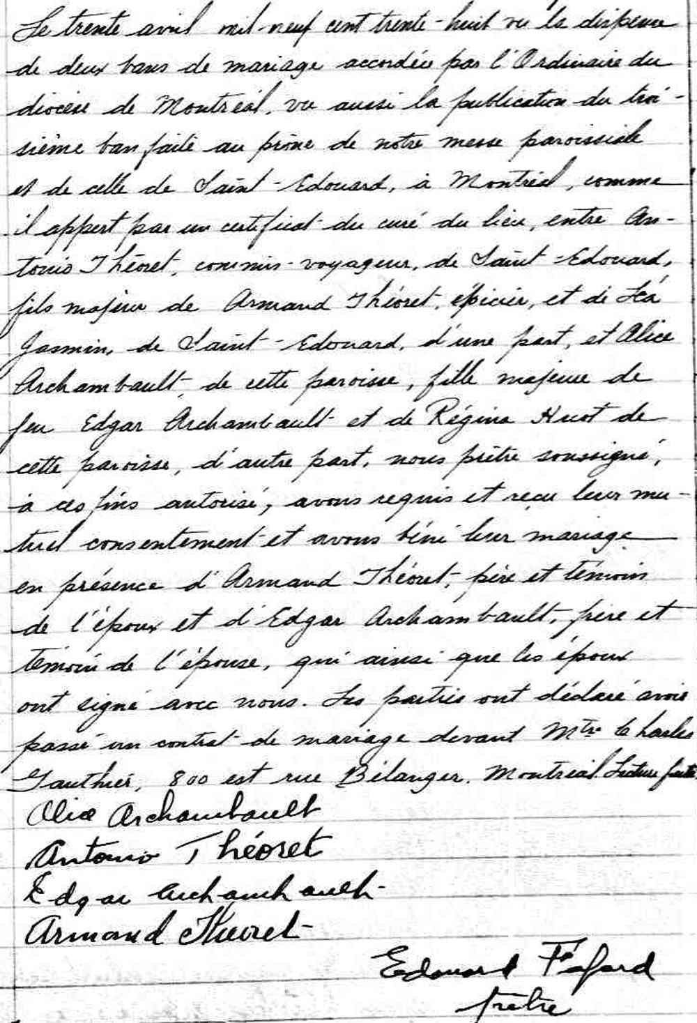 Mariage de Antonio Théoret et Alice Archambault à Notre Dame du Rosaire de Montréal le 30 avril 1938