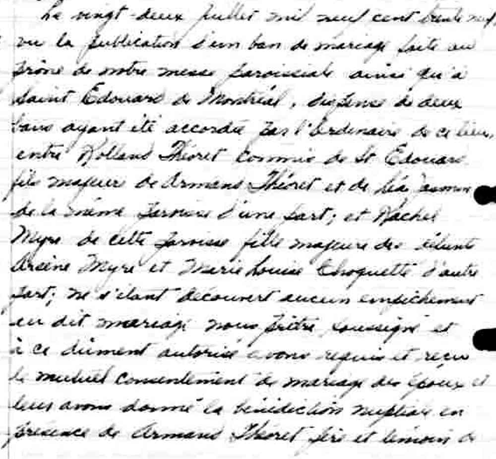 Mariage de Rolland Théoret et Rachel Myre à Saint Jean de la Croix de Montréal le 22 juillet 1939