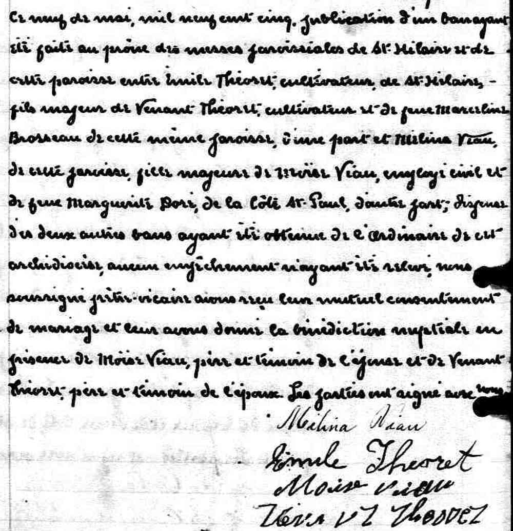 Mariage de Emile Théoret et Mélina Viau à Saint Jean Baptiste de Montréal le 9 mai 1905