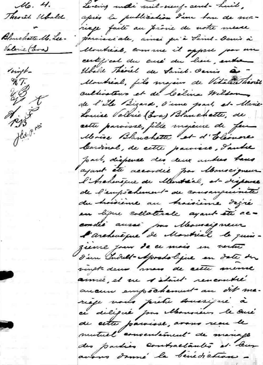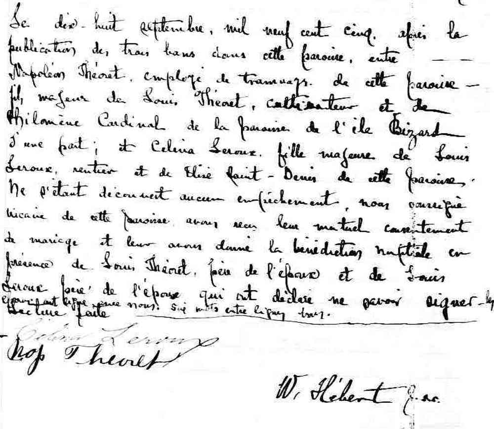 Mariage de Napoléon Théoret et Célina Leroux à Notre Dame de Montréal le 18 septembre 1905
