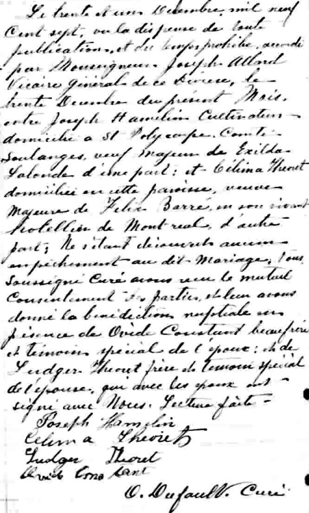 Mariage de Célina Théoret et Joseph Hamelin à Sainte Justine de Newton (comté de Vaudreuil) le 31 décembre 1907