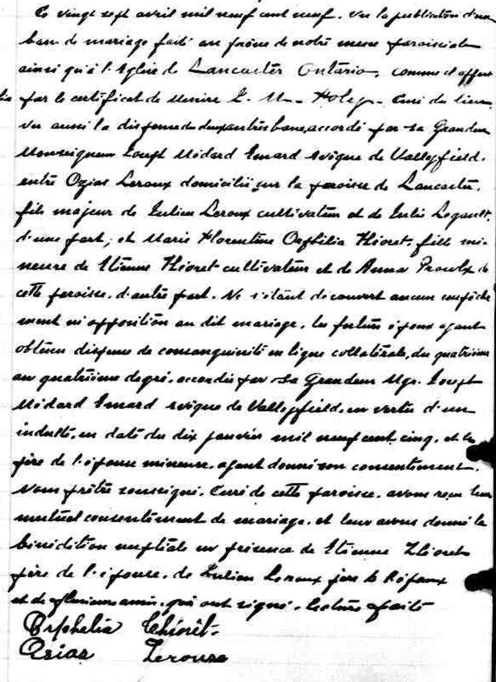 Mariage de Orphélia Théoret et Ozias Leroux à Saint Polycarpe (comté de Soulanges) le 27 avril 1909