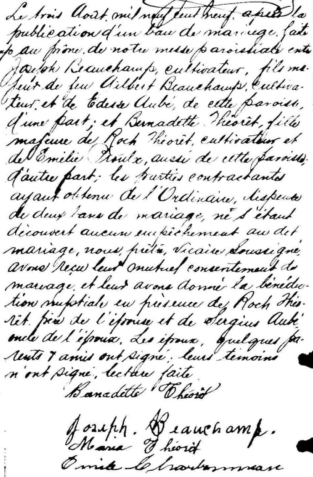 Mariage de Bernadette Théoret et Joseph Beauchamp à Saint Eustache le 3 août 1909