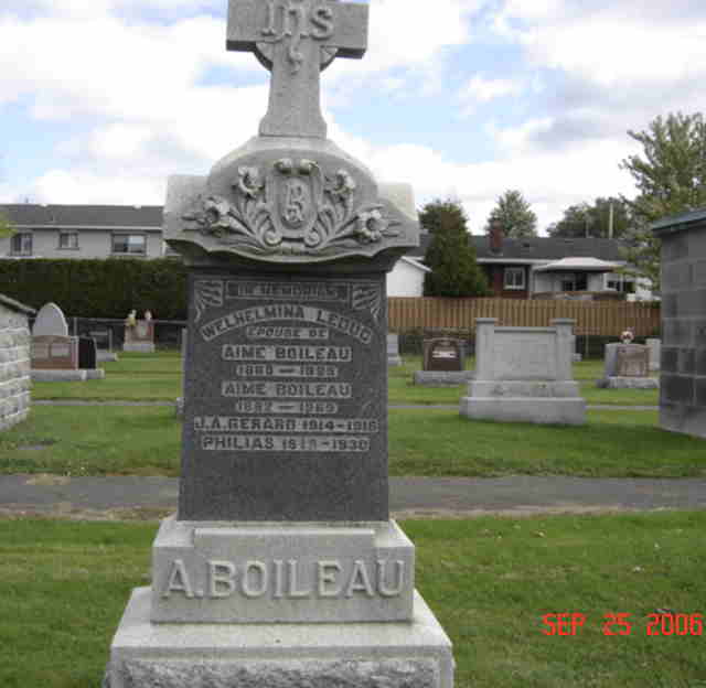 Pierre tombale de Aimé Boileau, Aimé Boileau époux de Welhelmina Leduc, de J. A. Gérard Boileau et de Philias Boileau (R)
