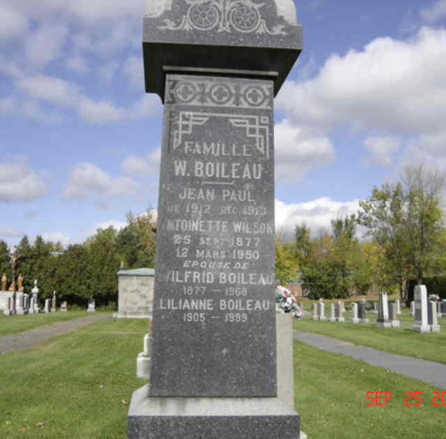 Pierre tombale de Wilfrid Boileau, époux de Antoinette Wilson, et leurs enfants Jean Paul Boileau et Lilianne Boileau (R)