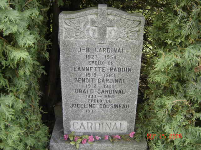 Pierre tombale de Jean Baptiste Cardinal, époux de Jeannette Paquin; de Benoît Cardinal; et de Ubald Cardinal, époux de Joceline Cousineau (G1)