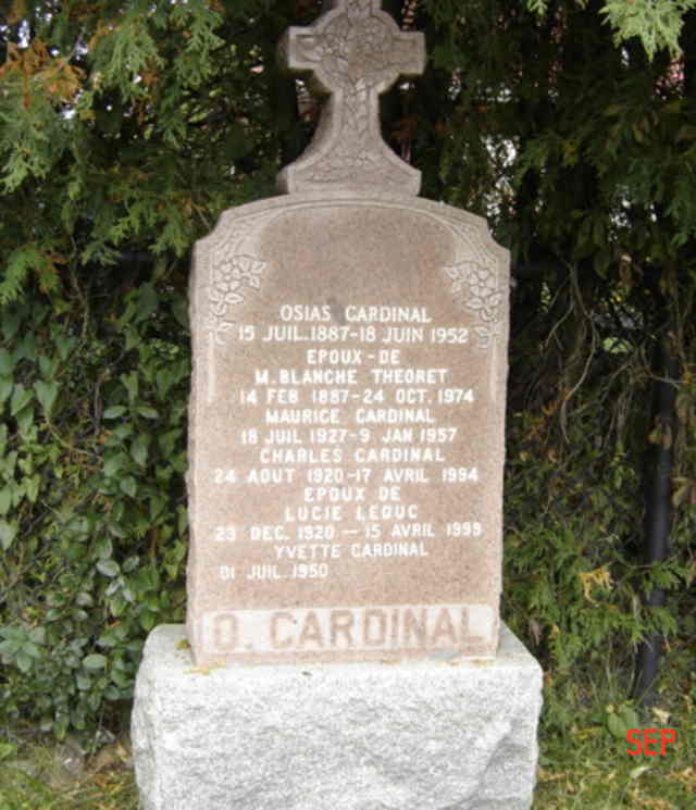 Pierre tombale de Osias Cardinal, époux de Marie Blanche Théoret; de Maurice Cardinal; de Charles Cardinal, époux de Lucie Leduc; et de Yvette Cardinal (R)