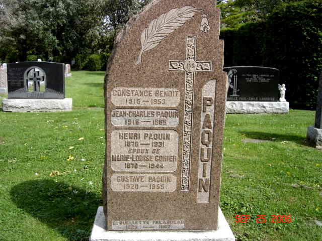 Pierre tombale de Jean Charles Paquin; Henri Paquin, époux de Marie Louise Gohier; et Gustave Paquin (G1)