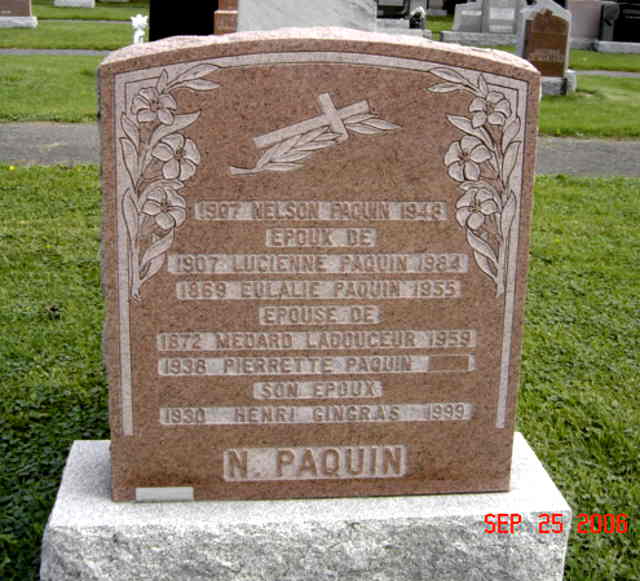 Pierre tombale de Nelson Paquin, époux de Lucienne Paquin; de Lucienne Paquin, épouse de Nelson Paquin; de Eulalie Paquin, épouse de Médard Ladouceur; de Pierrette Paquin, épouse de Henri Gingras (R)