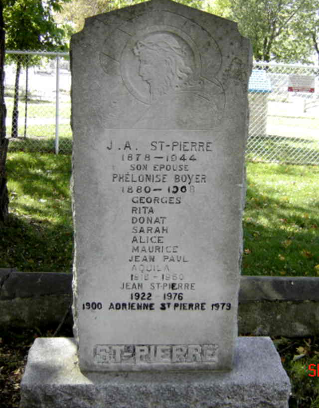 Pierre tombale de J. A. Saint-Pierre, époux de Phélonise Boyer; et de Georges, Rita, Donat, Sarah, Alice, Maurice, Jean Paul, Aquila, Jean et Adrienne Saint-Pierre (G1)