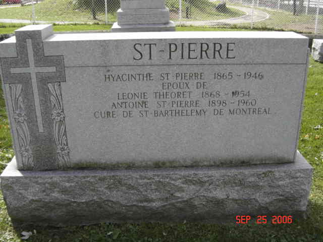 Pierre tombale de Hyacinthe Saint-Pierre, époux de Léonie Théoret; Antoine Saint-Pierre, curé de Saint Barthelémy de Montréal (G1)
