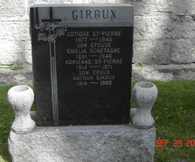 Pierre tombale de Zotique Saint-Pierre, époux de Émélia Schetagne; Adrienne Saint-Pierre, épouse de Arthur Giroux (G1)